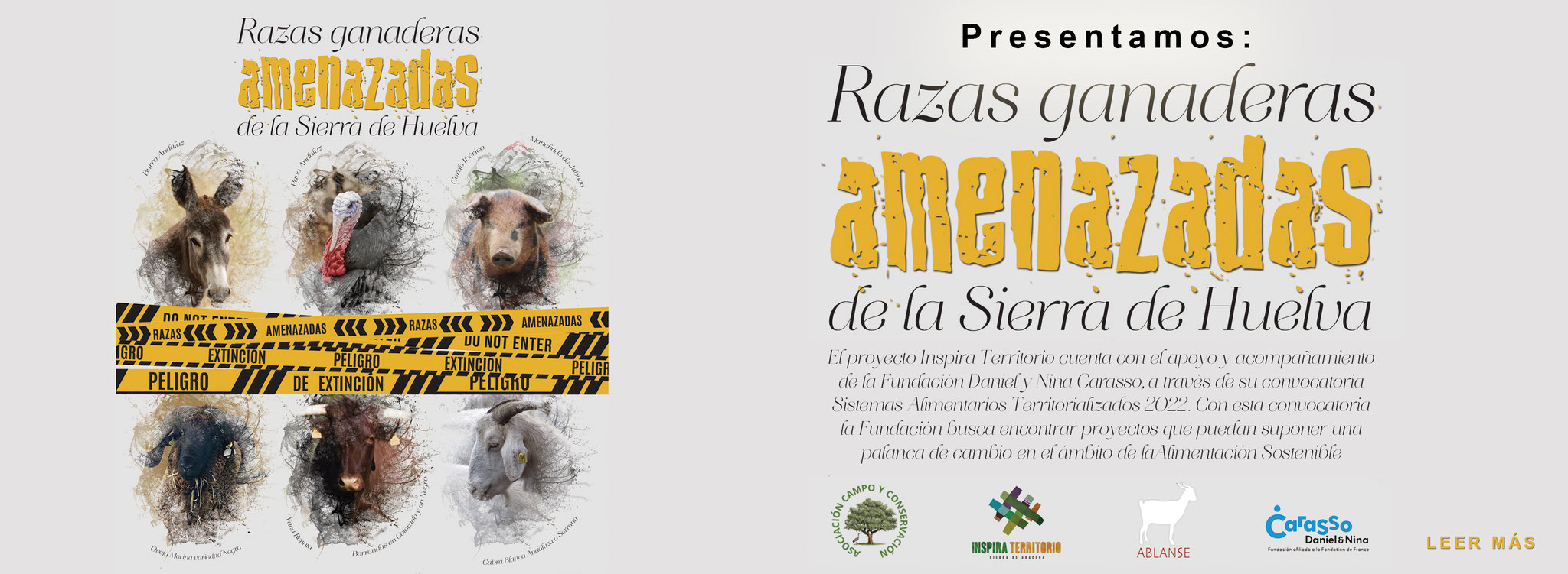 Presentamos "Razas Amenazadas de la Sierra de Huelva". El Proyecto Inspira Territorio cuenta con el apoyo y acompañamiento de la Fundación Daniel y Nina Carasso, a través de su convocatoria Sistemas Alimentarios Territorializados 2022. Con esta convocatoria la Fundación busca encontrar proyectos que puedan suponer una palanca de cambio en el ámbito de la Alimentación Sostenible. En este librito damos a conocer las Razas Amenazadas existentes en la Sierra de Huelva, así como sus características y el apoyo que obtienen a través de la gestión de las Asociaciones de Criadores y sus Programas de Cría que favorecen su conservación y variabilidad genética, así como reconocer la labor profesional y social de los criadores.